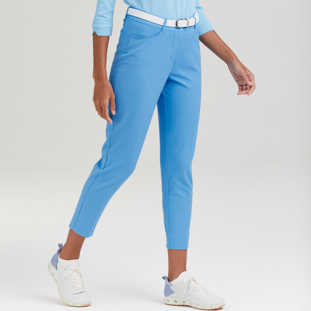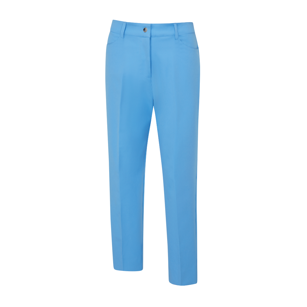Refresh your wardrobe with the ladies Cornflower Blue Vic Tapered Trousers. Designed for flexibility and performance, these slim golf trousers are finished with elegant details for a versatile, stylish look.